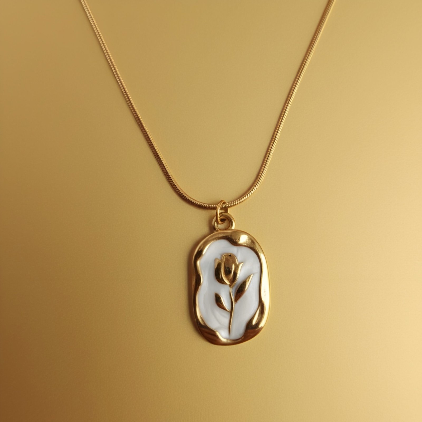 Elegant Gold-Plated White Enamel Rose Pendant Necklace (Phool Locket)Elegant Gold-Plated White Enamel Rose Pendant Necklace (Phool Locket)